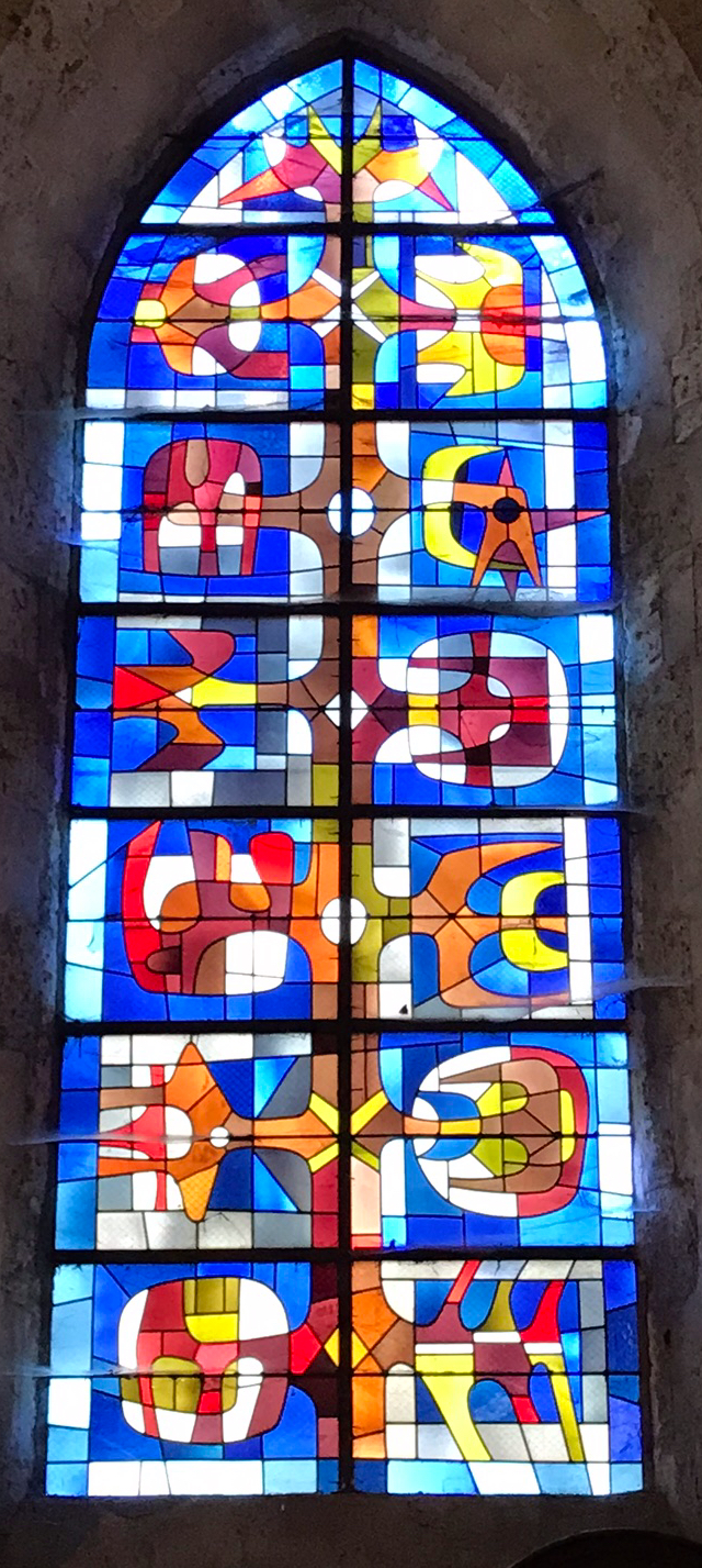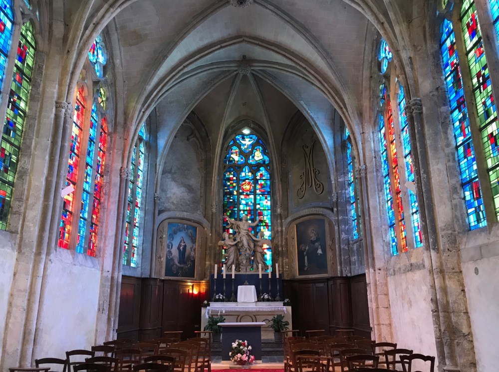 Nous avons passé la nuit d’après à Blois où on trouve… vous l’avez deviné… châteaux et grandes églises. L’Eglise Saint-Nicolas est un peu différente que des autres églises que nous avons vues — elle a des vitraux modernes qui tranchent avec le maçonnage ancien et les peintures anciennes. Les vitraux nous ont bien plu.