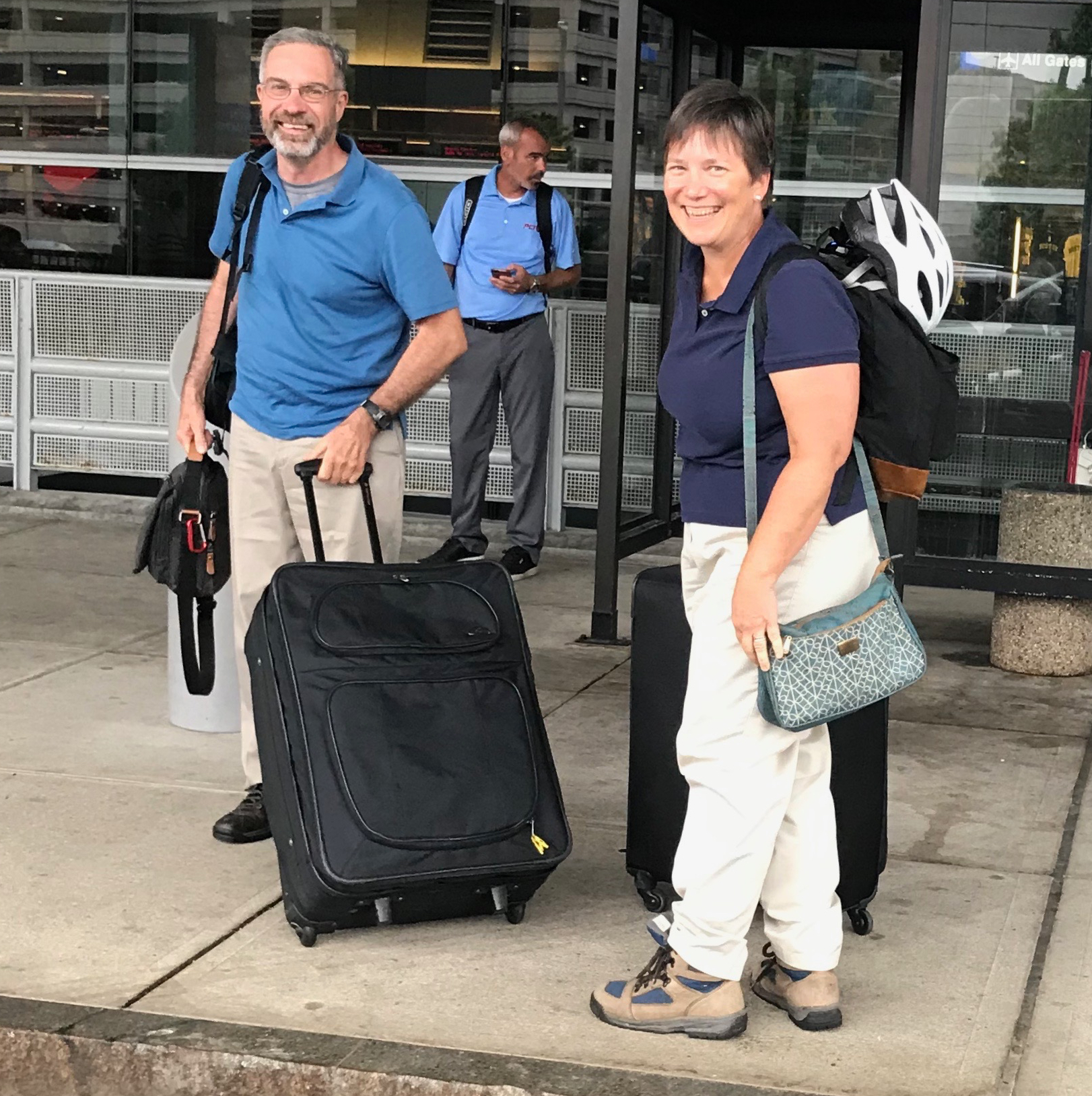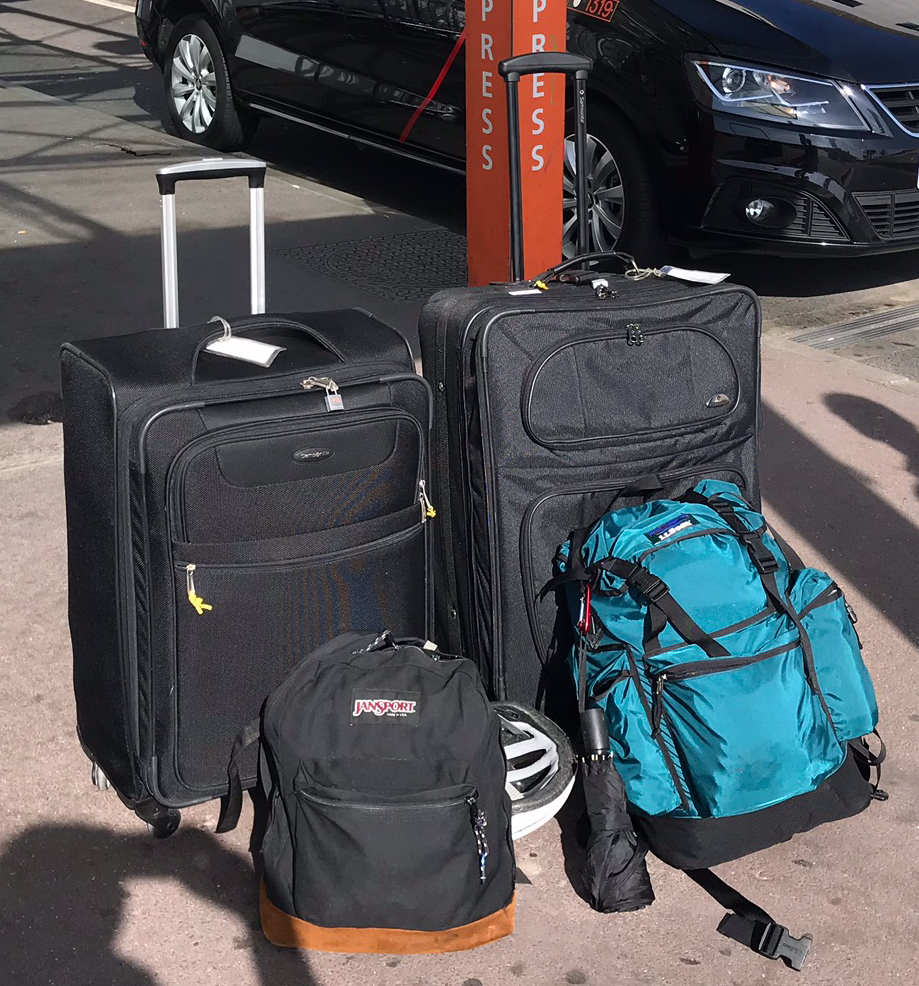 Oui, voilà tous nos bagages pour dix mois. Deux bagages, soigneusement limités à moins de 50 livres (22.7 kg), et deux sacs à dos. Nous nous inquiétions un peu que le balance à bagages chez nous ne serait pas en accord avec la balance de l’aéroport – nous ne voulions pas être obligés de sortir de choses de nos bagages au guichet. Heureusement, nous n’avons eu aucun problème.