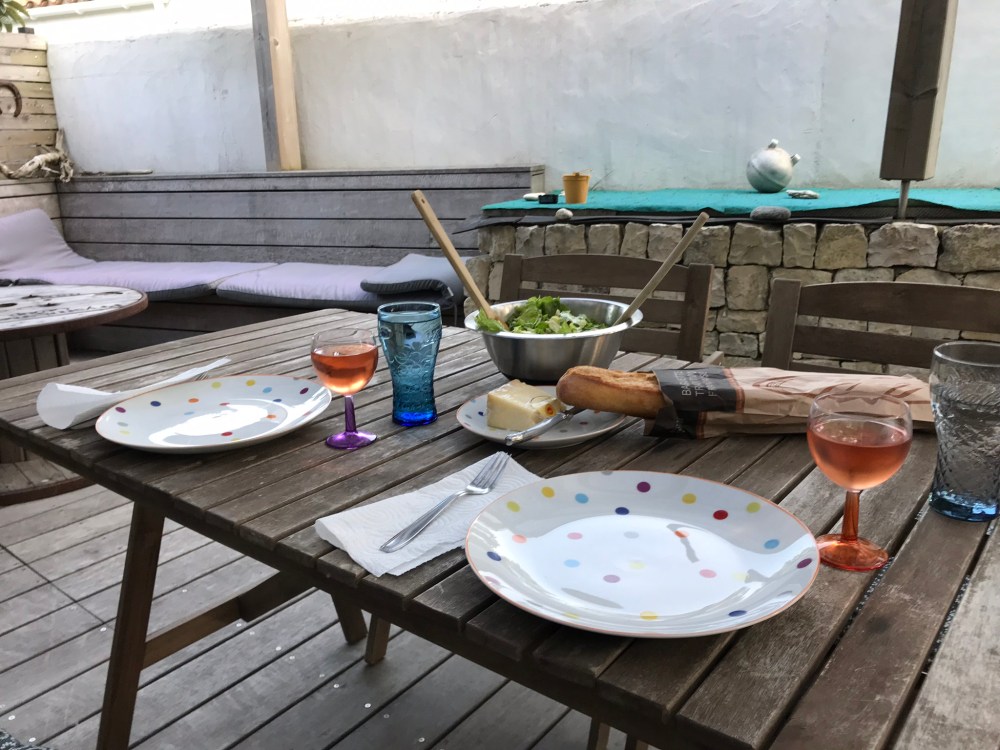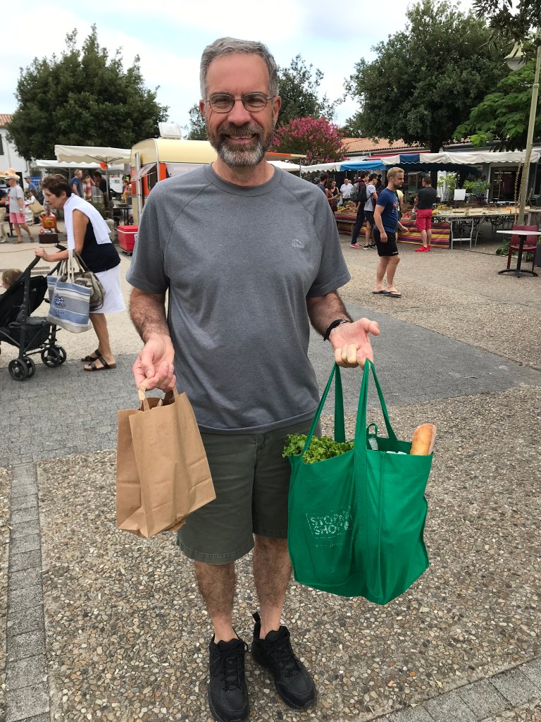 Maintenant nous nous sommes installés dans notre premier gîte, sur l’Île de Ré. Le marché le plus proche est très petit, mais on y trouve tout ce dont on en a besoin – du pain, des fruits, des légumes, et, le plus important, le poulet rôti du dimanche. Rôti entier sur la broche, ce sera peut-etre notre déjeuner tous les dimanches pendant notre séjour en France.
