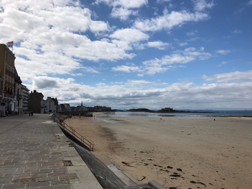Saint Malo a de grandes marées – pendant que nous y étions, la marée est montée et descendue de plus de 8 mètres. Notre chambre, qui donnait sur la promenade et la plage (quand il y en a une), nous offrait une vue magnifique de toutes les variations.