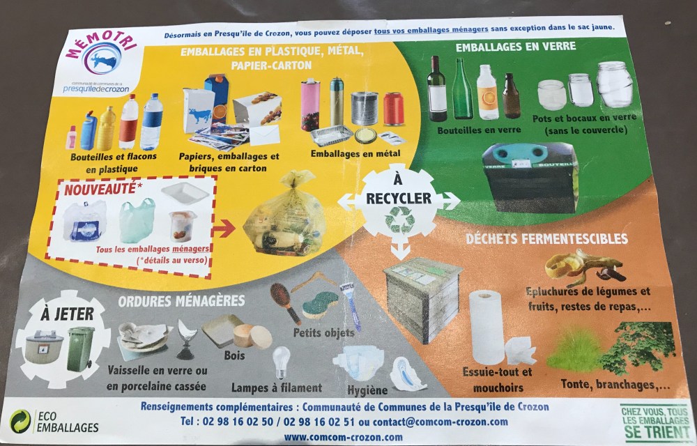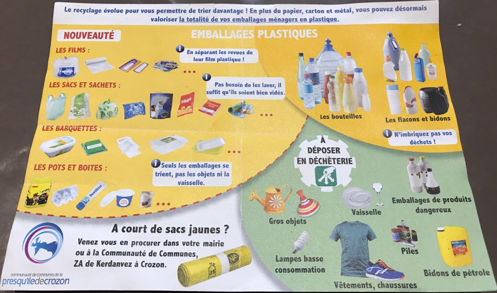 Beaucoup plus de choses sont recyclées en France. On trie tous les emballages, même les films en plastique, les bouchons, et les sacs en plastique. Chose étonnante, les essuie-tout et les mouchoirs en papier sont triés avec les compostables, pas avec les autre choses en papier.